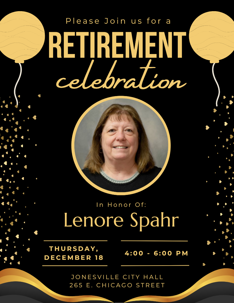 The City of Jonesville would like to invite you to a Retirement Celebration honoring Lenore Spahr on Thursday, December 18th at 4:00-6:00 p.m. at City Hall. Lenore has served as the City's Finance Director/Treasurer and Deputy Clerk for 23+ years. Congratulations on your retirement Lenore, we hope you enjoy every moment of this next phase of your life!